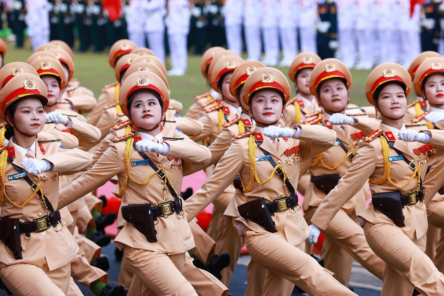 Khối nữ sĩ quan Cảnh sát giao thông diễu binh tại Lễ kỷ niệm 70 năm chiến thắng lịch sử Điện Biên Phủ . Ảnh: TTXVN