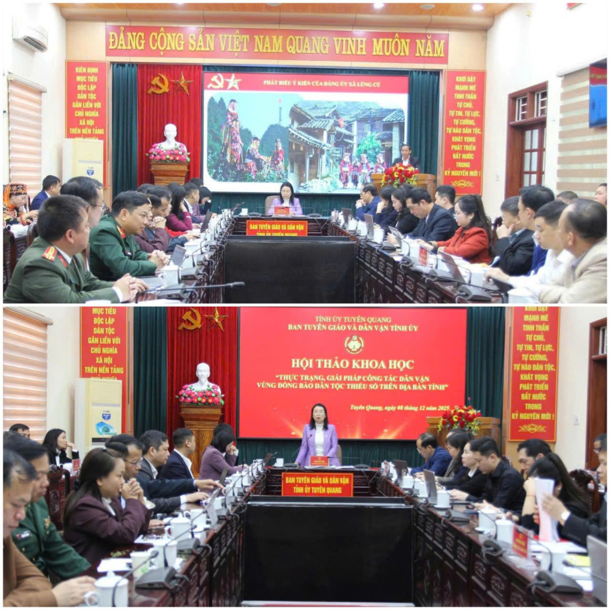 Phối hợp chặt chẽ trong tham mưu theo dõi, quản lý và thực hiện Đề tài “Nghiên cứu thực trạng và giải pháp tăng cường công tác dân vận vùng đồng bào dân tộc thiểu số tỉnh Tuyên Quang”; Ban Tuyên giáo và Dân vận Tỉnh ủy đã tiến hành khảo sát thực tiễn tại cơ sở, tổ chức hội thảo khoa học “Thực trạng, giải pháp công tác dân vận vùng đồng bào dân tộc thiểu số trên địa bàn tỉnh”, qua đó, trao đổi kinh nghiệm, cách làm hay, mô hình tiêu biểu trong công tác dân vận ở cơ sở, nhiều vấn đề đặt ra trong quá trình triển khai công tác dân vận gắn với chuyển đổi số, phát triển khoa học - công nghệ trong vùng đồng bào dân tộc thiểu số trên địa bàn tỉnh đã được phân tích, đánh giá toàn diện, làm cơ sở để đề xuất các giải pháp phù hợp với điều kiện thực tế của tỉnh, nhằm nâng cao chất lượng tham mưu, góp phần giúp cấp ủy, chính quyền các cấp lãnh đạo, chỉ đạo thực hiện sát thực tiễn, khả thi và hiệu quả.