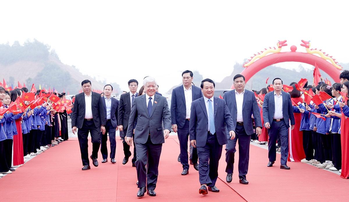 Phó Chủ tịch Thường trực Quốc hội Đỗ Văn Chiến và Bí thư Tỉnh uỷ Hầu A Lềnh và các đồng chí lãnh đạo tỉnh tại Lễ động thổ Dự án cao tốc Tuyên Quang - Hà Giang giai đoạn 2 (từ xã Tân Quang đi Cửa khẩu quốc tế Thanh Thủy) và thông xe kỹ thuật Dự án cao tốc Tuyên Quang - Hà Giang giai đoạn 1